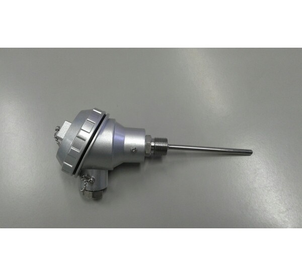 Termorresistência do tipo PT100, haste (inox 316) de 6mm de diâmetro por 100mm de comprimento útil, cabeçote grande de alumínio e rosca inox de 1/2"BSP, para até 300°C.