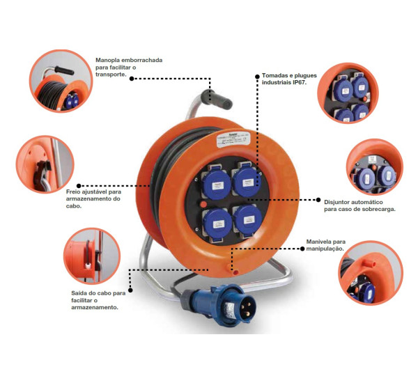 | Características | O rolo de extensão industrial IP67 conta com vantagens projetadas pensando no usuário, oferecendo ergonomia, agilidade e facilidade de uso com muita segurança. - Modelo: 30004 - Cabo: 30 metros ( H07RN-F ) 4x2,5mm² - Tomada: Industrial CEE IP67 3P+T 16A/380V IP67 Industrial CEE 3P+E 16/380V - Plugue: 3 Industrial CEE IP67 3P+T 16A/380V 3 Industrial CEE IP67 3P+T 16A/380V |